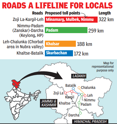 Toll is proposed to be collected at Padum on the road via Shinku La connecting Darcha in Himachal Pradesh with the SrinagarLeh highway near Nimmu, even though it is in a rudimentary stage with several river crossings suitable for off-road vehicles. It is touted as an alternative to the Manali Leh road. The road to Chalunka across the Khardung La is Leh’s only link to the northern areas of Nubra valley. Toll is to be collected at Khalsar, where the road bifurcates west for Turtuk and north for Siachen Base Camp.