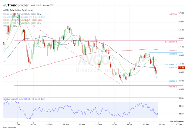 Currently, Broadcom stock is rallying into the 50% retracement of the current range, as well as the 10-day and 50-day moving averages. This is a key spot on the chart, as it would be easy for the stock to fail at this zone.