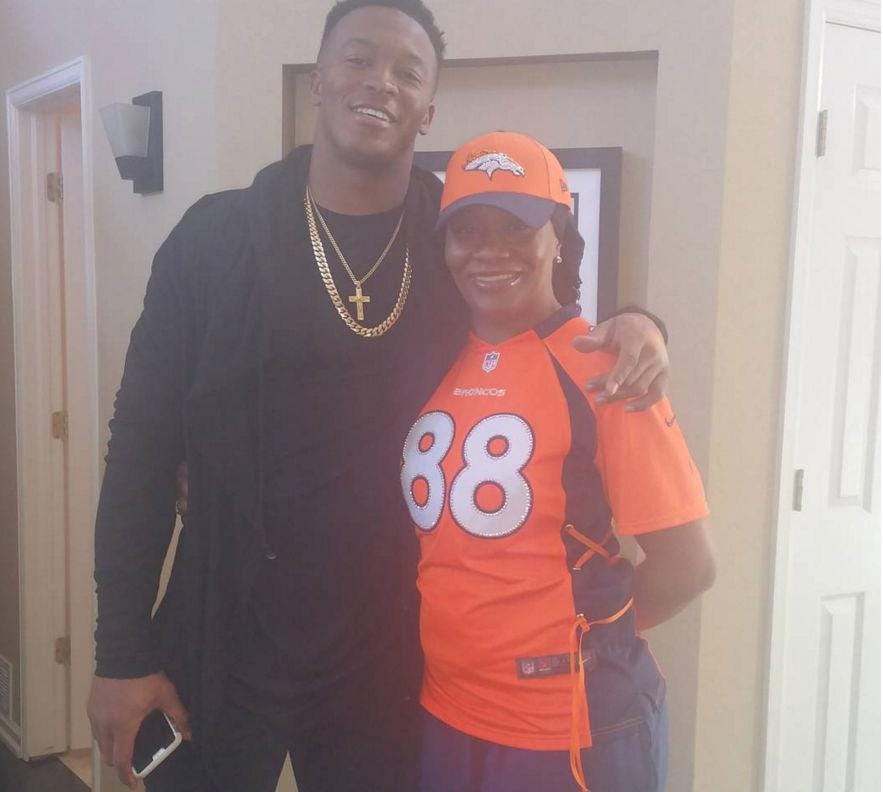 Katrina Smith, mother of Broncos player Demaryius Thomas, was in the crowd on Sunday night for the first time after she was convicted of drug trafficking in 2000. Mr Thomas was 12 years old when she was convicted and his mother had never attended one of his professional games.