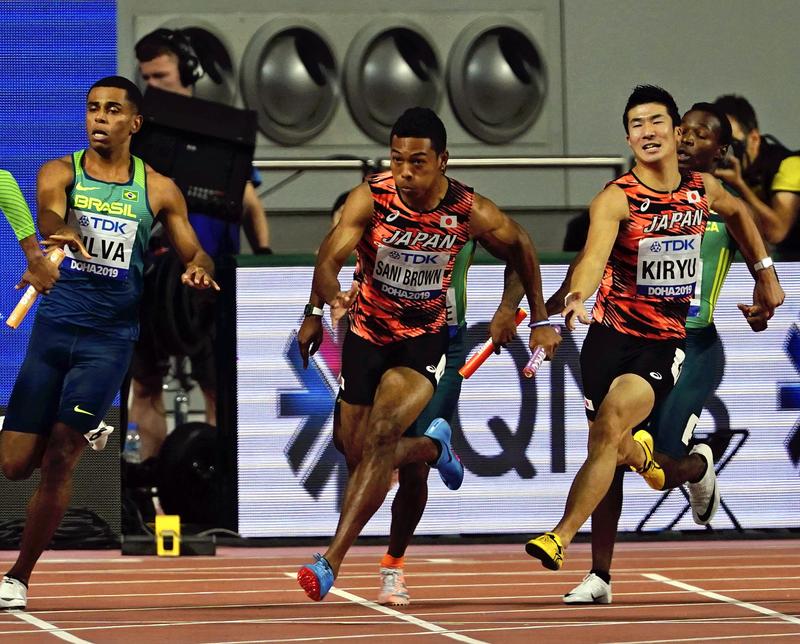 Japan anchor Abdul Hakim Sani Brown receives the baton from Yoshihide Kiryu in the men's 4x100-meter relay final at the IAAF World Athletics Championships in Doha on Saturday. With Shuhei Tada and Kirara Shiraishi running the first two legs, Japan won bronze in 37.43 seconds, lowering the team's Asian record and securing a berth in the event at the 2020 Tokyo Olympics. Related story on Page 15