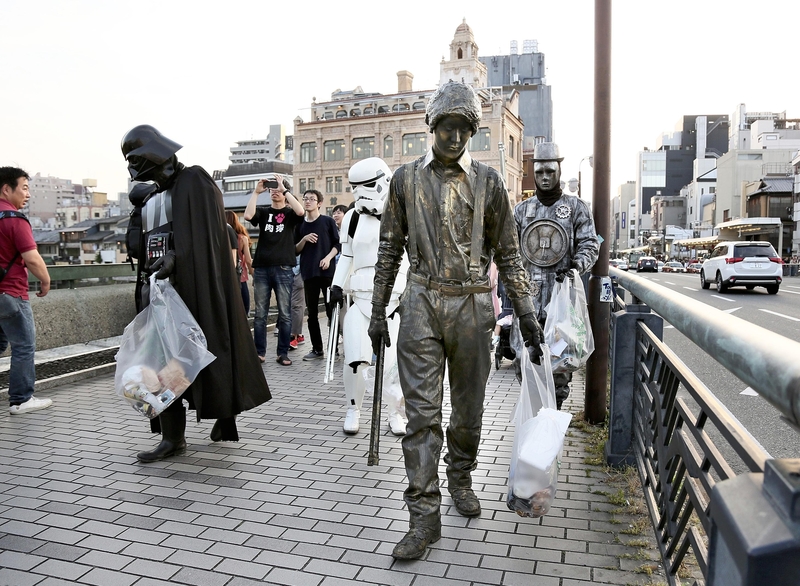 Bronze statues on a street corner suddenly start moving and picking up garbage -- the cleanup activities of street performers are attracting attention in the Kawaramachi district of Kyoto, which is crowded with tourists.