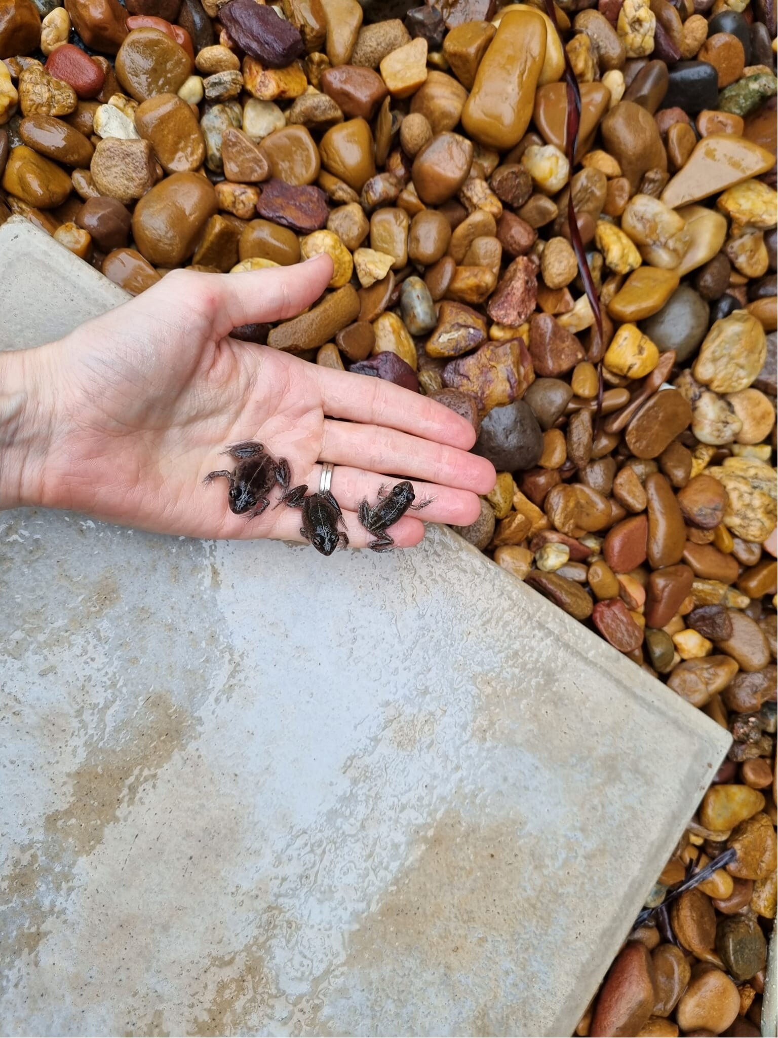 A self-proclaimed frog lover, Ms Larke was worried they could die, so she jumped into action and found herself wading around in her pyjamas scooping up tiny frogs at 5:30am.