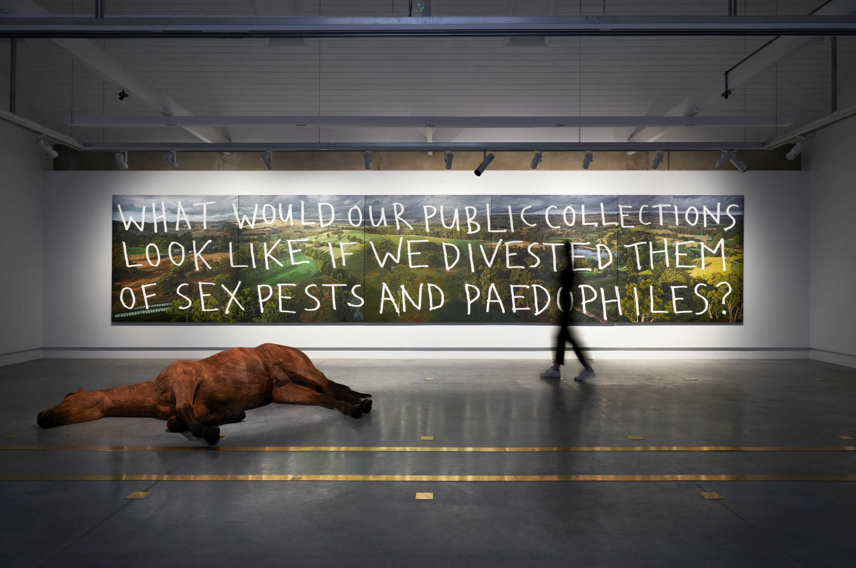 In Land Abounds, their new exhibition, it looks like this: a dead horse painfully carved out of Indonesian jelutong timber, lying in front of a panoramic 10-metre-long landscape painting of Berrima, with this sentence scrawled across the canvas: "What would our public collections look like if we divested them of sex pests and paedophiles?"