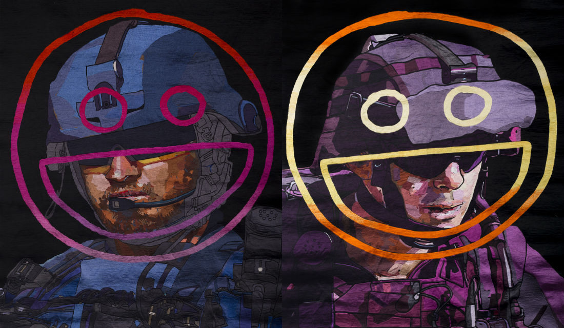 In 2019, Abdul created the tapestries All Let Us Rejoice and For We Are Young and Free, featuring embroidered portraits of members of the Australian armed forces with their facial features obscured by helmets and sunglasses and stamped with crude smiley emojis.