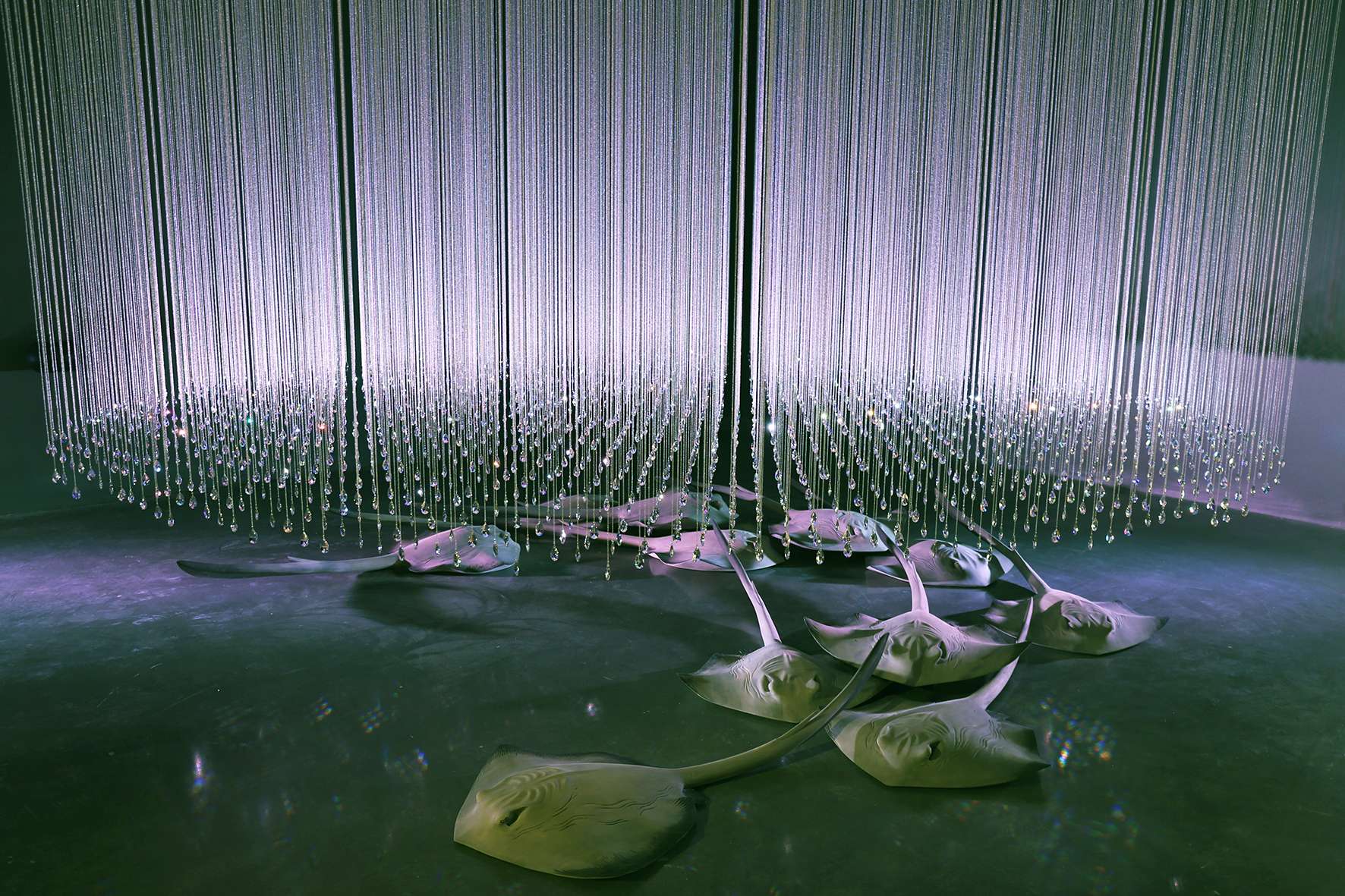 However, the work operates on multiple levels, also exploring how the predatory instincts of dogs have been used to intimidate people, control crowds and police closed borders. The chandeliers represent the glittering aspirational spaces the animals guard.