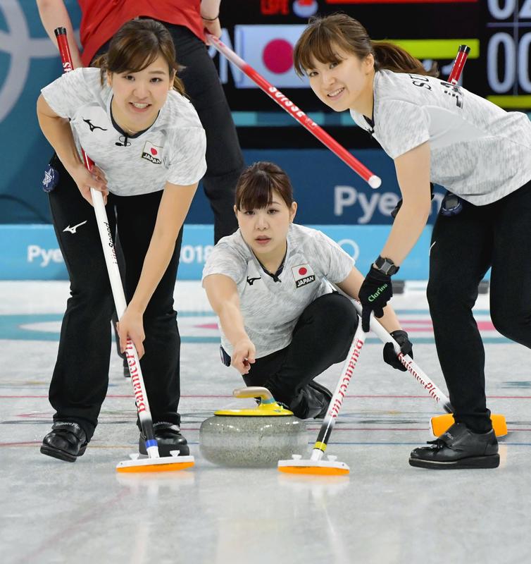 Japan's Yurika Yoshida, center, slides a stone in the third end of a round-robin match against Switzerland at the Gangneung Curling Center on Wednesday. The Japan women's team lost to Switzerland 8-4 but advanced to the semifinals for the first time by finishing fourth in the 10-team format. Japan faces South Korea in today's semifinals.