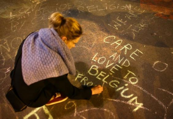 Thousands of people gathered outside the stock exchange in Brussels to draw messages in chalk of solidarity and defiance after Tuesday's deadly bomb attacks.