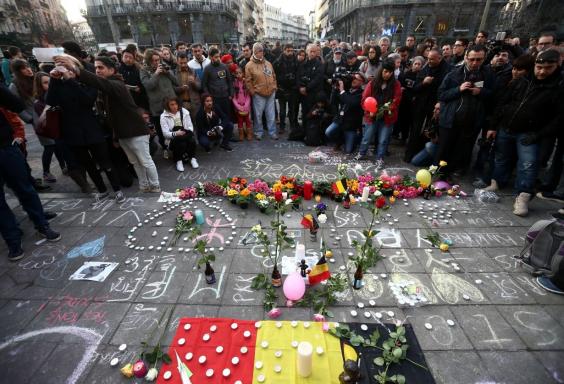 Brussels' Place de la Bourse became an improvised memorial of flags, tea lights, balloons and flowers.