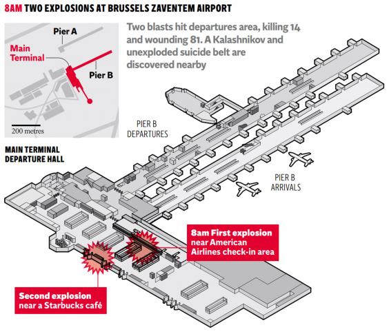 Shortly after 8am local time, two explosions were heard minutes apart in the departure hall of the airport.