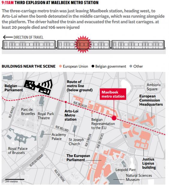 About an hour after the airport blasts, there was an explosion at Maalbeek Metro station, which is close to a number of EU institutions