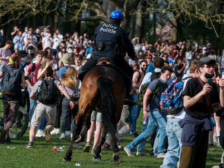 Riot police in Belgium have used horses and water cannon to disperse crowds of revellers gathered in defiance of coronavirus rules, apparently in response to a fake festival created as an April Fools’ joke.