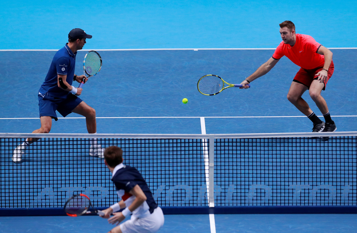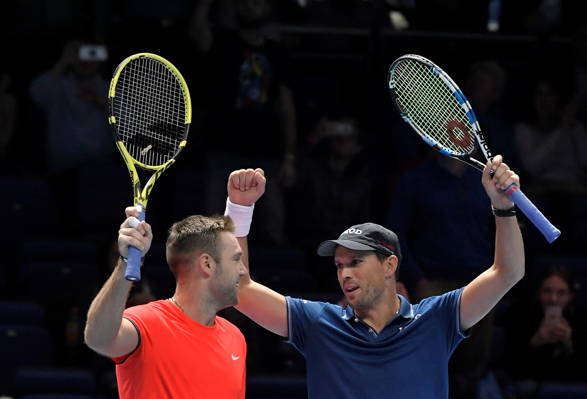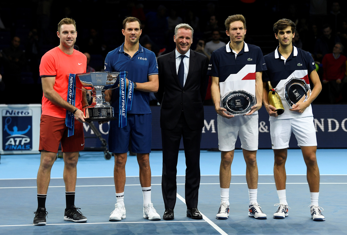 Tennis - ATP Finals - The O2, London, Britain - November 18, 2018 Mike Bryan and Jack Sock of the U.S. during their doubles match against France's Pierre-Hugues Herbert and Nicolas Mahut Action Images via Reuters/Andrew CouldridgeTennis - ATP Finals - The O2, London, Britain - November 18, 2018 Mike Bryan and Jack Sock of the U.S. celebrate with a trophy after winning the doubles final Action Images via Reuters/Tony O'BrienTennis - ATP Finals - The O2, London, Britain - November 18, 2018 Mike Bryan and Jack Sock of the U.S. celebrate after winning the doubles final Action Images via Reuters/Tony O'BrienTennis - ATP Finals - The O2, London, Britain - November 18, 2018 France's Pierre-Hugues Herbert and Nicolas Mahut in action during their doubles match against Mike Bryan and Jack Sock of the U.S. Action Images via Reuters/Andrew Couldridge
