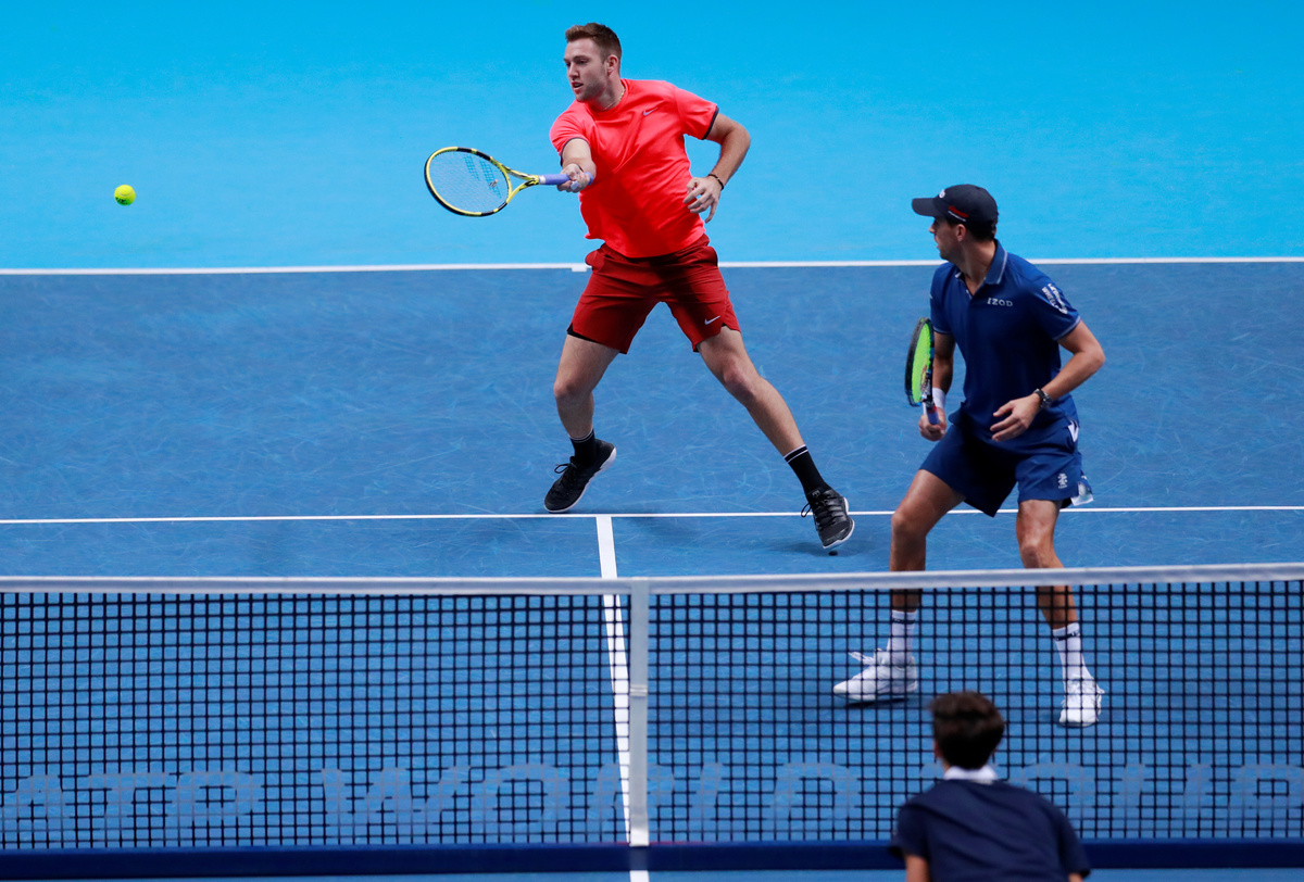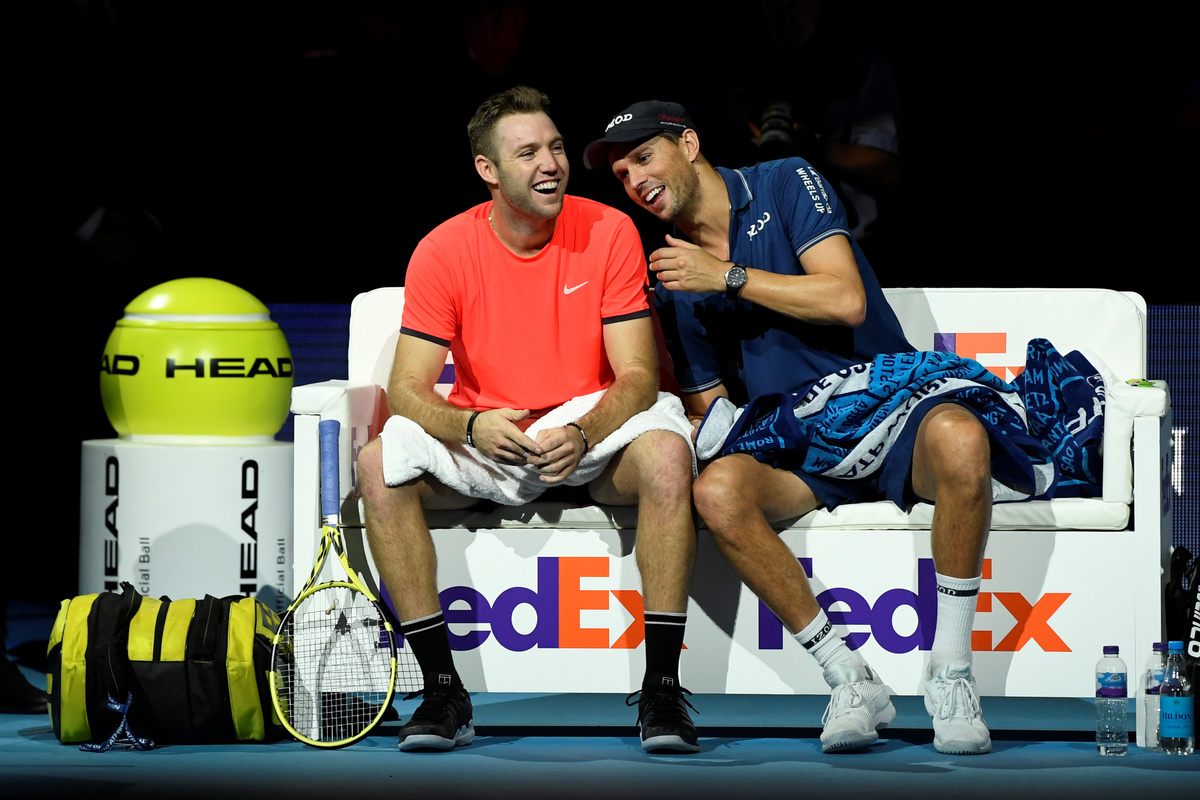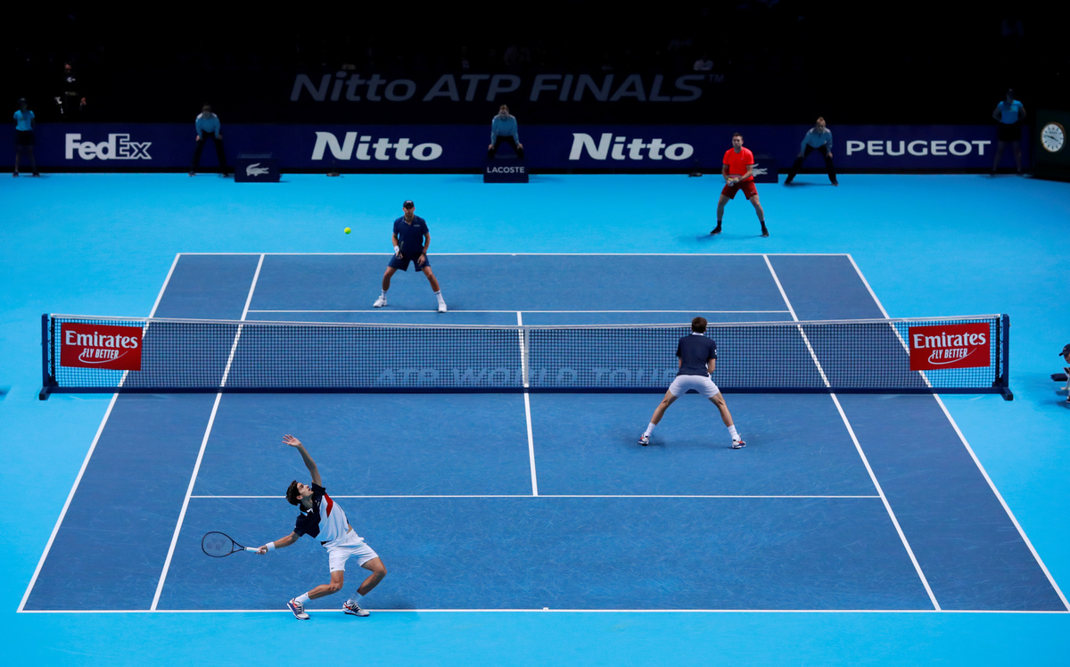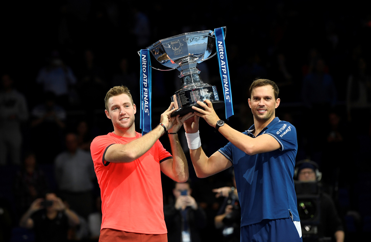 Tennis - ATP Finals - The O2, London, Britain - November 18, 2018 Mike Bryan and Jack Sock of the U.S. during their doubles match against France's Pierre-Hugues Herbert and Nicolas Mahut Action Images via Reuters/Andrew CouldridgeTennis - ATP Finals - The O2, London, Britain - November 18, 2018 Mike Bryan and Jack Sock of the U.S. celebrate with a trophy after winning the doubles final Action Images via Reuters/Tony O'BrienTennis - ATP Finals - The O2, London, Britain - November 18, 2018 Mike Bryan and Jack Sock of the U.S. celebrate after winning the doubles final Action Images via Reuters/Tony O'BrienTennis - ATP Finals - The O2, London, Britain - November 18, 2018 France's Pierre-Hugues Herbert and Nicolas Mahut in action during their doubles match against Mike Bryan and Jack Sock of the U.S. Action Images via Reuters/Andrew Couldridge