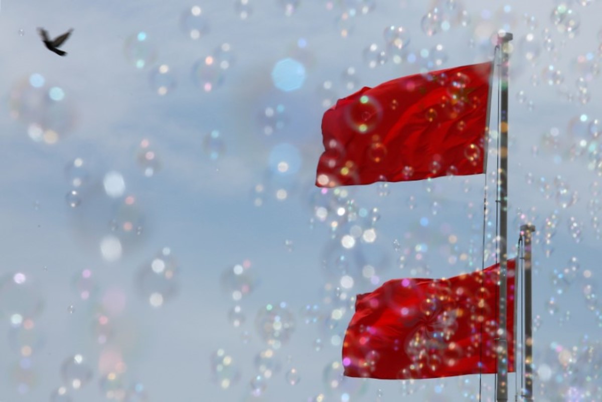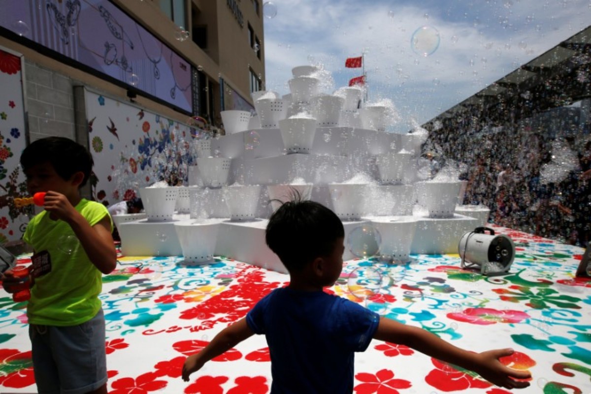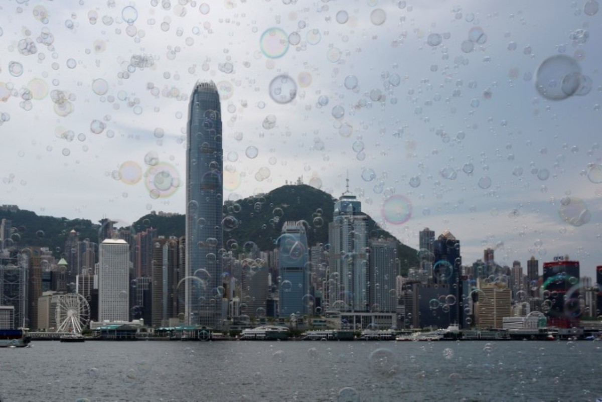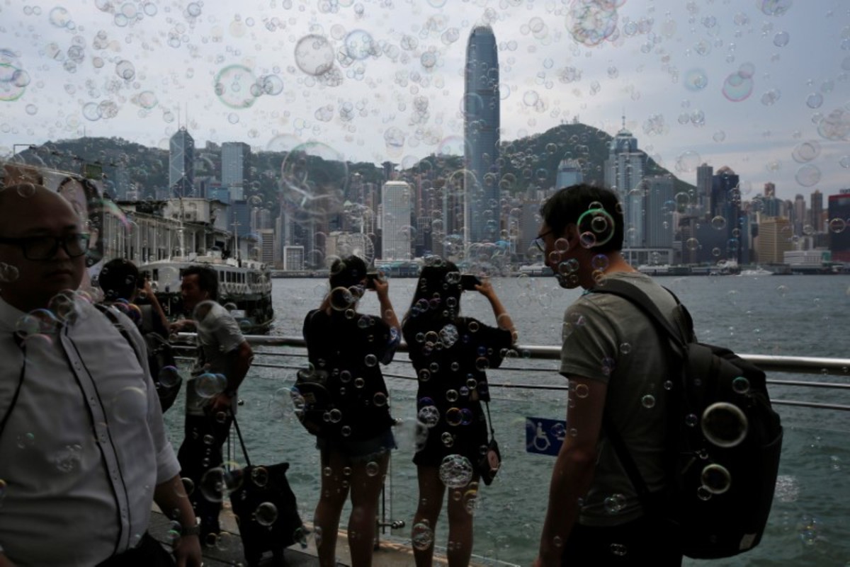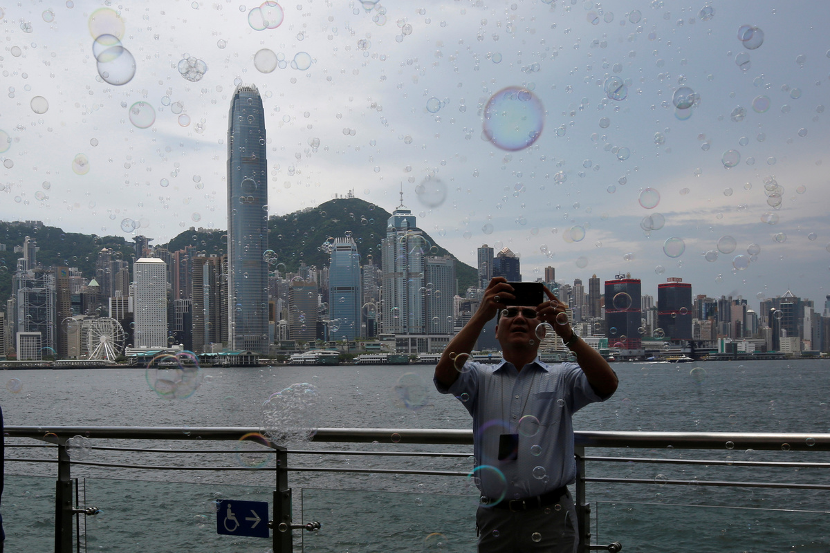 Bubbles are seen in front of a Chinese national flag (top) and a Hong Kong flag, during a "Bubble Up" show by Japanese artist Shinji Ohmaki, outside Harbour City mall in Hong Kong, China August 2, 2017. REUTERS/Bobby YipBubbles are seen in front of the skyline of the financial Central district, during a "Bubble Up" show by Japanese artist Shinji Ohmaki, outside Harbour City mall in Hong Kong, China August 2, 2017. REUTERS/Bobby YipBubbles are seen in front of the skyline of the financial Central district, during a "Bubble Up" show by Japanese artist Shinji Ohmaki, outside Harbour City mall in Hong Kong, China August 2, 2017. REUTERS/Bobby YipChildren react in front of bubbles, during a "Bubble Up" show by Japanese artist Shinji Ohmaki, outside Harbour City mall in Hong Kong, China August 2, 2017. REUTERS/Bobby Yip