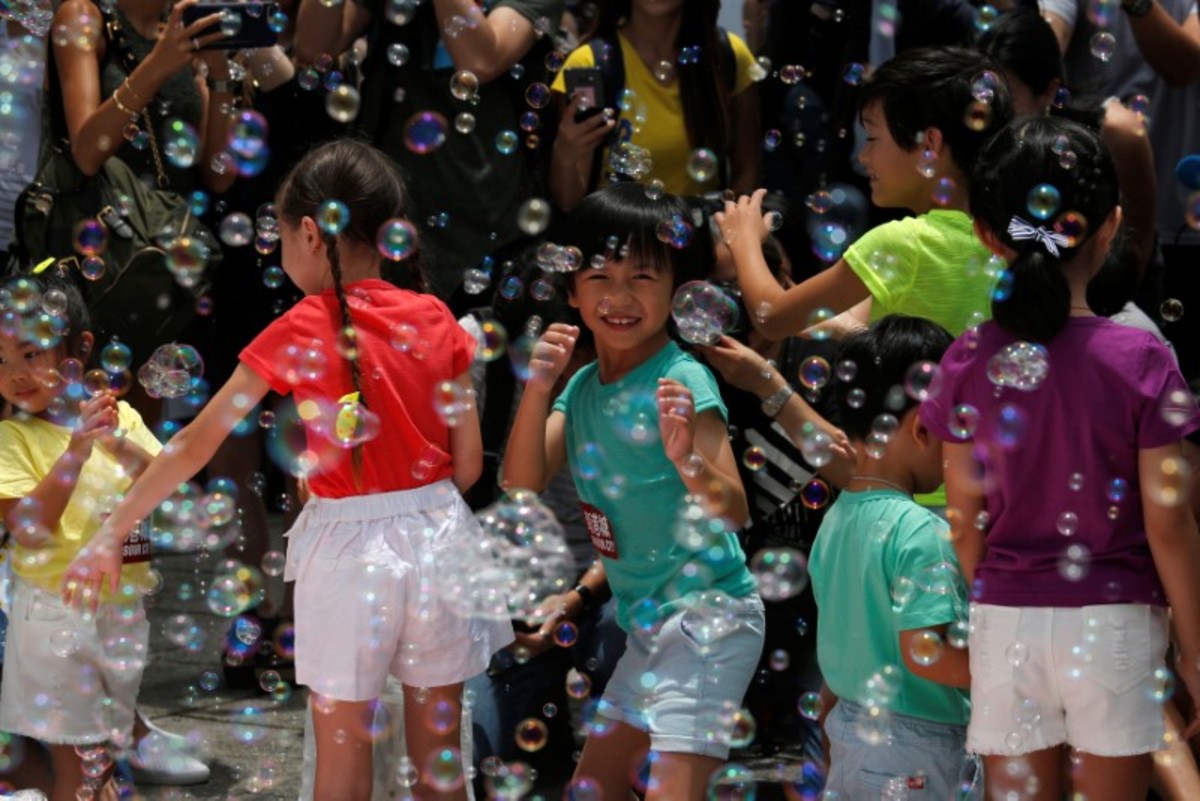 Children react in front of bubbles, during a "Bubble Up" show by Japanese artist Shinji Ohmaki, outside Harbour City mall in Hong Kong, China August 2, 2017. REUTERS/Bobby Yip