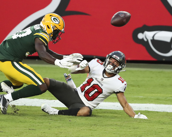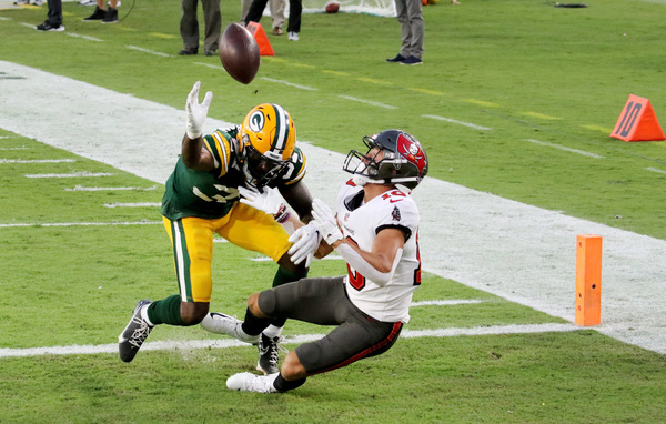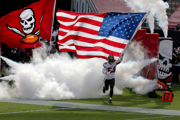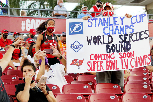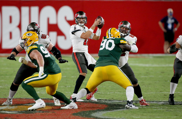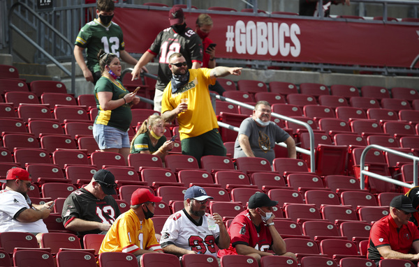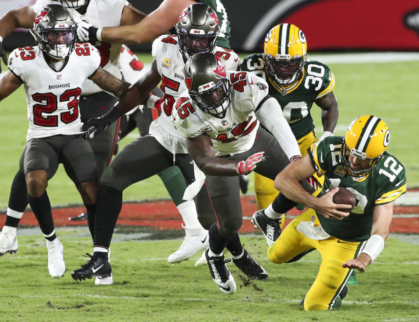 Tampa Bay Buccaneers inside linebacker Devin White (45) sacks Green Bay Packers quarterback Aaron Rodgers (12) during the fourth quarter on Sunday, Oct. 18, 2020, at Raymond James Stadium in Tampa, Florida. (Douglas R. Clifford/Tampa Bay Times/TNS)Green Bay Packers running back Aaron Jones (33) is pursued by Tampa Bay Buccaneers inside linebacker Lavonte David (54), defensive tackle Rakeem Nunez-Roches (56) and cornerback Carlton Davis (24) during the third quarter on Sunday, Oct. 18, 2020, at Raymond James Stadium in Tampa, Florida. (Douglas R. Clifford/Tampa Bay Times/TNS)Tampa Bay Buccaneers tight end Rob Gronkowski (87) waves to fans as he walks along the sidelines while heading into the tunnel after the game against the Green Bay Packers on Sunday, Oct. 18, 2020, at Raymond James Stadium in Tampa, Florida. (Dirk Shadd/Tampa Bay Times/TNS)Green Bay Packers quarterback Aaron Rodgers (12) and Tampa Bay Buccaneers quarterback Tom Brady (12) visit at mid-field at the conclusion of the fourth quarter on Sunday, Oct. 18, 2020, at Raymond James Stadium in Tampa, Florida. (Douglas R. Clifford/Tampa Bay Times/TNS)Tampa Bay Buccaneers linebacker Chapelle Russell (53) hustles an American flag onto the field before the start of the game against the Green Bay Packers on Sunday, Oct. 18, 2020, at Raymond James Stadium in Tampa, Florida. (Douglas R. Clifford/Tampa Bay Times/TNS)Green Bay Packers quarterback Aaron Rodgers (12) is hurried by Tampa Bay Buccaneers inside linebacker Devin White (45) and defensive end Ndamukong Suh (93) during the first quarter on Sunday, Oct. 18, 2020, at Raymond James Stadium in Tampa, Florida. (Douglas R. Clifford/Tampa Bay Times/TNS)Tampa Bay Buccaneers and Green Bay Packers fans in the stands before the Buccaneers take on the Packers on Sunday, Oct. 18, 2020, at Raymond James Stadium in Tampa, Florida. (Dirk Shadd/Tampa Bay Times/TNS)Tampa Bay Buccaneers quarterback Blaine Gabbert (11) loads up for a pass during the fourth quarter against the Green Bay Packers on Sunday, Oct. 18, 2020, at Raymond James Stadium in Tampa, Florida. (Douglas R. Clifford/Tampa Bay Times/TNS)Tampa Bay Buccaneers cornerback Jamel Dean (35) intercepts Green Bay Packers quarterback Aaron Rodgers (12) and returns the ball 32 yards for a touchdown during second quarter action on Sunday, Oct. 18, 2020, at Raymond James Stadium in Tampa, Florida. (Dirk Shadd/Tampa Bay Times/TNS)Hope Howard, 6, and her mother, Carolyn Howard, of Tampa, in the stands during the first quarter of a game between the Green Bay Packers and the Tampa Bay Buccaneers on Sunday, Oct. 18, 2020, at Raymond James Stadium in Tampa, Florida. (Douglas R. Clifford/Tampa Bay Times/TNS)Tampa Bay Buccaneers defensive end William Gholston (92) busts through the Green Bay Packers offense during the third quarter on Sunday, Oct. 18, 2020, at Raymond James Stadium in Tampa, Florida. (Douglas R. Clifford/Tampa Bay Times/TNS)Green Bay Packers cornerback Josh Jackson (37), left, makes contact with Tampa Bay Buccaneers wide receiver Scotty Miller (10) early and picks up a pass interference penalty during the third quarter on Sunday, Oct. 18, 2020, at Raymond James Stadium in Tampa, Florida. The play set up a rushing touchdown by Buccaneers running back Ronald Jones II (27). (Dirk Shadd/Tampa Bay Times/TNS)Tampa Bay Buccaneers running back Ronald Jones (27) rushes into the Green Bay Packers defense during the second quarter on Sunday, Oct. 18, 2020, at Raymond James Stadium in Tampa, Florida. (Douglas R. Clifford/Tampa Bay Times/TNS)A pass intended for Green Bay Packers wide receiver Marquez Valdes-Scantling (83) is disrupted by Tampa Bay Buccaneers cornerback Carlton Davis (24) during the second quarter on Sunday, Oct. 18, 2020, at Raymond James Stadium in Tampa, Florida. (Douglas R. Clifford/Tampa Bay Times/TNS)Fans are socially distanced in the 300 level during the first quarter of the game between the Bay Packers at Buccaneers and the Tampa Bay Buccaneers on Sunday, Oct. 18, 2020, at Raymond James Stadium in Tampa. (Douglas R. Clifford/Tampa Bay Times/TNS)Tampa Bay Buccaneers cornerback Jamel Dean (35) and Tampa Bay Buccaneers inside linebacker Devin White (45) celebrate Dean's interception during the second quarter of the game between the Bay Packers at Buccaneers and the Tampa Bay Buccaneers on Sunday, Oct. 18, 2020, at Raymond James Stadium in Tampa. (Douglas R. Clifford/Tampa Bay Times/TNS)Fans during the third quarter of a game between the Green Bay Packers and the Tampa Bay Buccaneers on Sunday, Oct. 18, 2020, at Raymond James Stadium in Tampa, Florida. (Douglas R. Clifford/Tampa Bay Times/TNS)Green Bay Packers backup quarterback Tim Boyle (8) recovers his own fumble while being sacked after replacing quarterback Aaron Rodgers in the fourth quarter against the Tampa Bay Buccaneers on Sunday, Oct. 18, 2020, at Raymond James Stadium in Tampa, Florida. (Dirk Shadd/Tampa Bay Times/TNS)Tampa Bay Buccaneers defensive tackle Ndamukong Suh (93) sacks Green Bay Packers quarterback Aaron Rodgers (12) at the end of the second quarter on Sunday, Oct. 18, 2020, at Raymond James Stadium in Tampa, Florida. (Dirk Shadd/Tampa Bay Times/TNS)Tampa Bay Buccaneers running back Ronald Jones II (27) gets by Green Bay Packers linebacker Ty Summers (44) and scores a touchdown on a 2-yard run during second quarter action on Sunday, Oct. 18, 2020, at Raymond James Stadium in Tampa, Florida. (Dirk Shadd/Tampa Bay Times/TNS)Green Bay Packers cornerback Josh Jackson (37) disrupts a pass intended for Tampa Bay Buccaneers wide receiver Scott Miller (10) during the third quarter on Sunday, Oct. 18, 2020, at Raymond James Stadium in Tampa, Florida. The play resulted in a pass interference call for Green Bay. (Douglas R. Clifford/Tampa Bay Times/TNS)Tampa Bay Buccaneers cornerback Sean Murphy-Bunting (23), left, forces a fumble by Green Bay Packers quarterback Tim Boyle (8), center, during the fourth quarter on Sunday, Oct. 18, 2020, at Raymond James Stadium in Tamp
