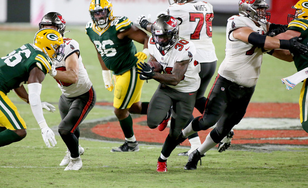 Tampa Bay Buccaneers running back Ke'Shawn Vaughn (30) breaks through the Green Bay Packers defense during the fourth quarter on Sunday, Oct. 18, 2020, at Raymond James Stadium in Tampa, Florida. (Douglas R. Clifford/Tampa Bay Times/TNS)