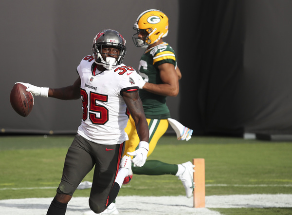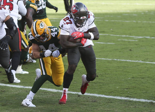 Tampa Bay Buccaneers running back Ronald Jones II (27) gets past Green Bay Packers safety Adrian Amos (31) as he rushes for a touchdown in the third quarter on Sunday, Oct. 18, 2020, at Raymond James Stadium in Tampa, Florida. (Dirk Shadd/Tampa Bay Times/TNS)