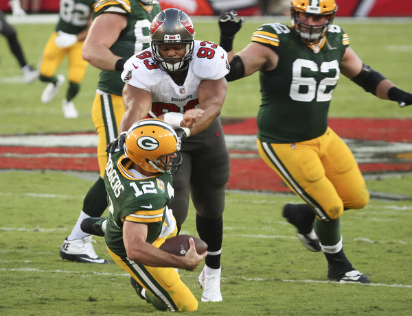 Rodgers entered the game having only been sacked three times. But the Bucs defense was relentless. Lavonte David, who made plays sideline to sideline, sacked Rodgers in the first half. Then just before the teams went to the locker room, Ndamukong Suh put Rodgers in the ground.