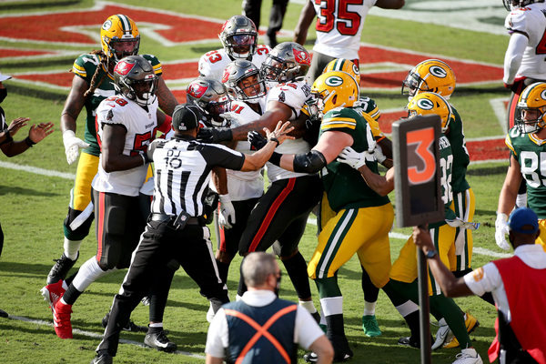 Tempers flare during the first quarter between the Green Bay Packers and the Tampa Bay Buccaneers on Sunday, Oct. 18, 2020, at Raymond James Stadium in Tampa, Florida. (Douglas R. Clifford/Tampa Bay Times/TNS)