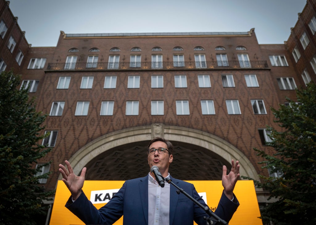 Budapest’s liberal mayor, Gergely Karacsony, who is one of five contenders to lead a coalition of main opposition parties, spoke to several hundred supporters who gathered despite early autumn drizzle in the capital.
