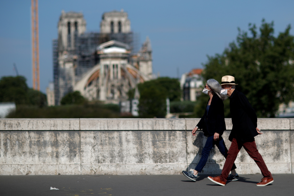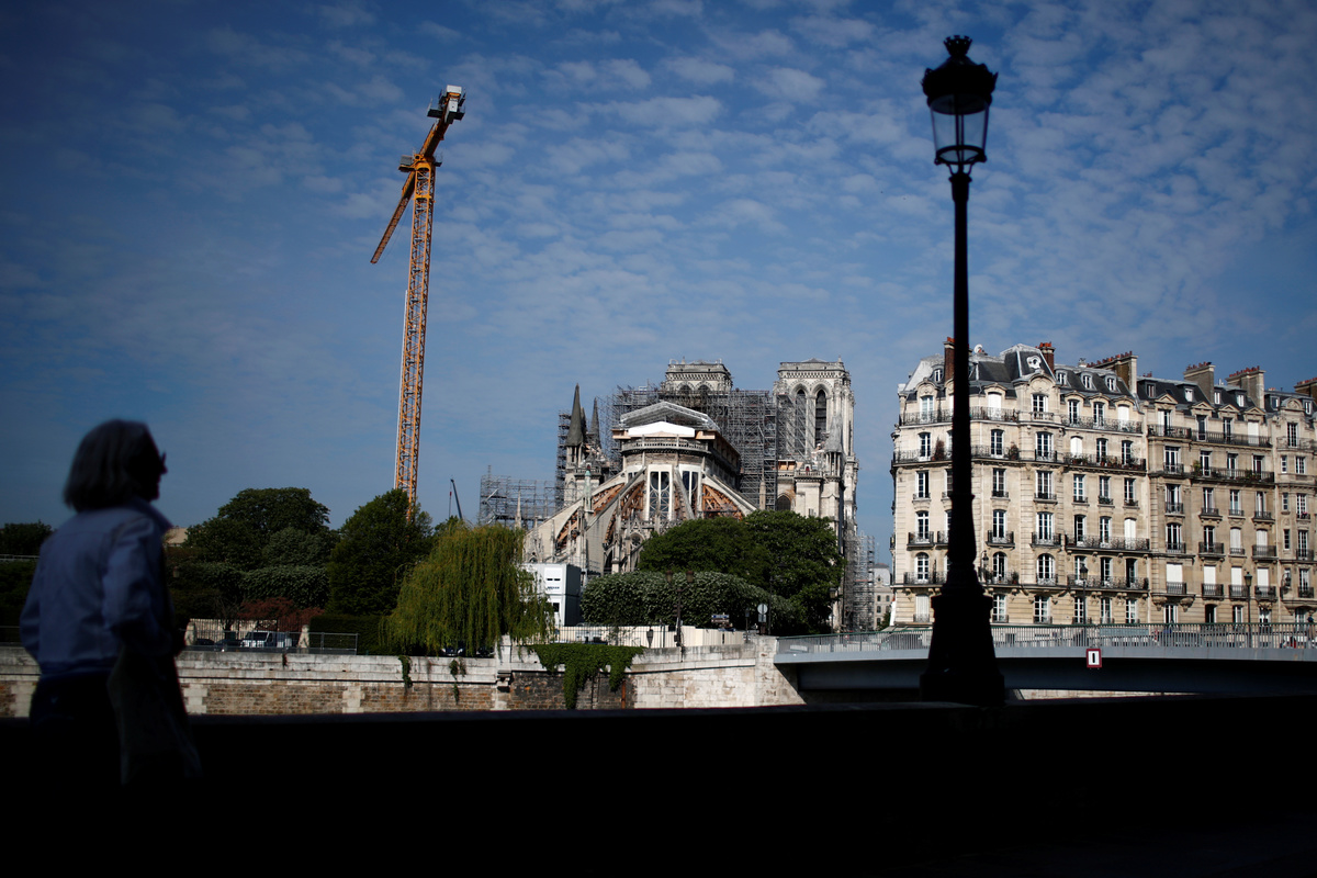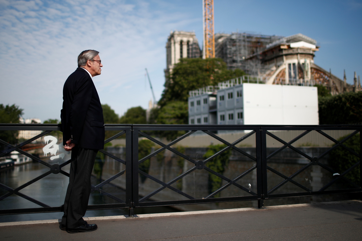 A view shows Notre-Dame de Paris Cathedral, which was damaged in a devastating fire one year ago, as restoration work resumes slowly after an interruption due to the lockdown imposed to slow the rate of the coronavirus disease (COVID-19) in Paris, France, April 27, 2020. REUTERS/Gonzalo FuentesNotre-Dame de Paris Cathedral's rector Patrick Chauvet attends an interview as restoration work resumes slowly at Notre-Dame de Paris Cathedral, which was damaged in a devastating fire one year ago, after an interruption due to the lockdown imposed to slow the rate of the coronavirus disease (COVID-19) in Paris, France, April 27, 2020. REUTERS/Gonzalo FuentesA woman, wearing a protective face mask, walks past Notre-Dame de Paris Cathedral, which was damaged in a devastating fire one year ago, as restoration work resumes slowly after an interruption due to the lockdown imposed to slow the rate of the coronavirus disease (COVID-19) in Paris, France, April 27, 2020. REUTERS/Gonzalo FuentesPeople, wearing protective face masks, walk on a bridge past Notre-Dame de Paris Cathedral, which was damaged in a devastating fire one year ago, as restoration work resumes slowly after an interruption due to the lockdown imposed to slow the rate of the coronavirus disease (COVID-19) in Paris, France, April 27, 2020. REUTERS/Gonzalo FuentesNotre-Dame de Paris Cathedral's rector Patrick Chauvet talks during an interview as restoration work resumes slowly at Notre-Dame de Paris Cathedral, which was damaged in a devastating fire one year ago, after an interruption due to the lockdown imposed to slow the rate of the coronavirus disease (COVID-19) in Paris, France, April 27, 2020. REUTERS/Gonzalo Fuentes