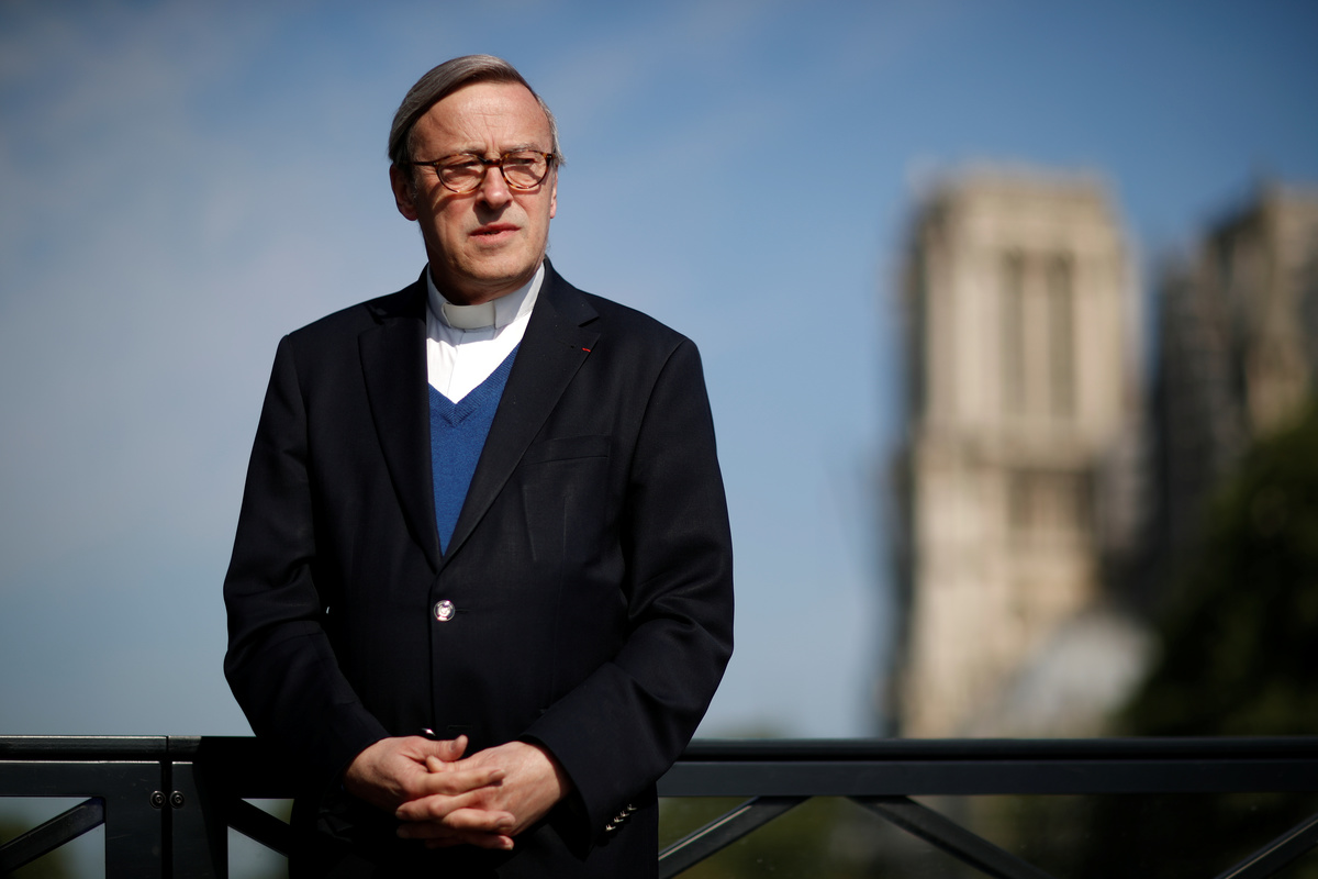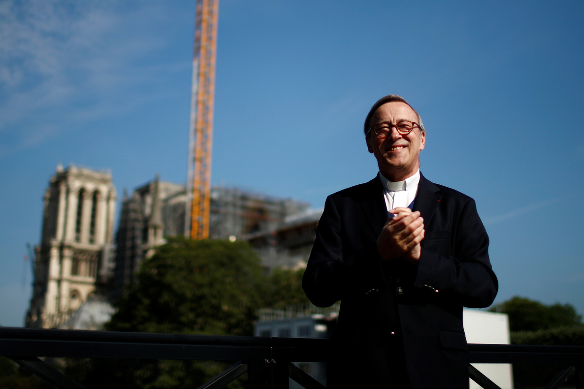 Notre-Dame de Paris Cathedral's rector Patrick Chauvet attends an interview as restoration work resumes slowly at Notre-Dame de Paris Cathedral, which was damaged in a devastating fire one year ago, after an interruption due to the lockdown imposed to slow the rate of the coronavirus disease (COVID-19) in Paris, France, April 27, 2020. REUTERS/Gonzalo Fuentes