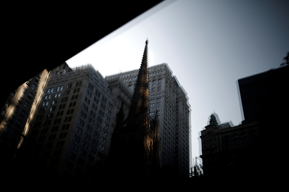 A reflection of Trinity Church is seen in the Financial District of Lower Manhattan in New York, U.S., August 11, 2019. The church wasÊbuilt in 1696 with the use of enslaved people. REUTERS/Carlos Barria
