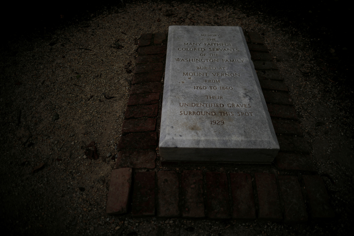 A plaque which reads, "In memory of the many faithful colored servants of the Washington Family buried at Mount Vernon from 1760 to 1860, Their unidentified graves surround this spot, 1929" is seen at Mount Vernon estate, home of George Washington, the first President of the United States, in Fairfax County, Virginia, U.S., August 15, 2019. REUTERS/Carlos Barria