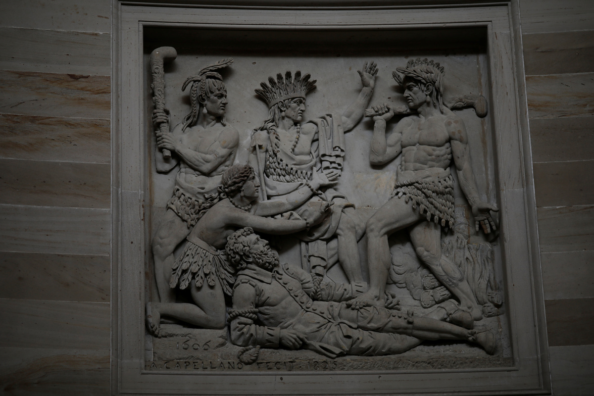 A relief knows as "Preservation of Captain Smith by Pocahontas, 1606" is seen above a rotunda door in the U.S. Capitol in Washington, U.S., August 16, 2019. One of the most iconic symbols of American democracy, the U.S. Capitol, was built using enslaved labor who were involved in all aspects of construction, including carpentry, masonry, plastering, glazing and painting. REUTERS/Carlos Barria