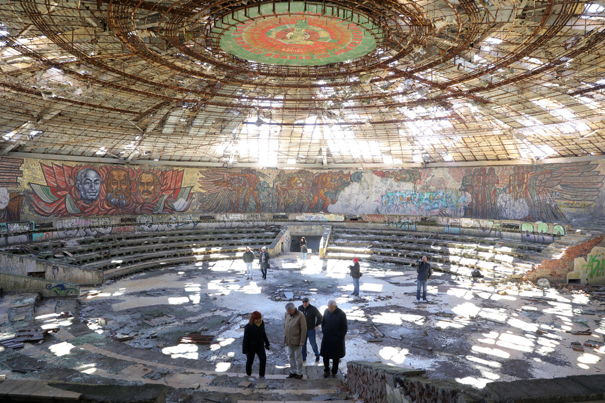 Beneath the hammer and sickle at to center of the dome, intricate mosaics along its curved walls depict communist propaganda and graffiti engulfs the original murals of Karl Marx, Vladimir Lenin and Bulgarian leaders of the past.