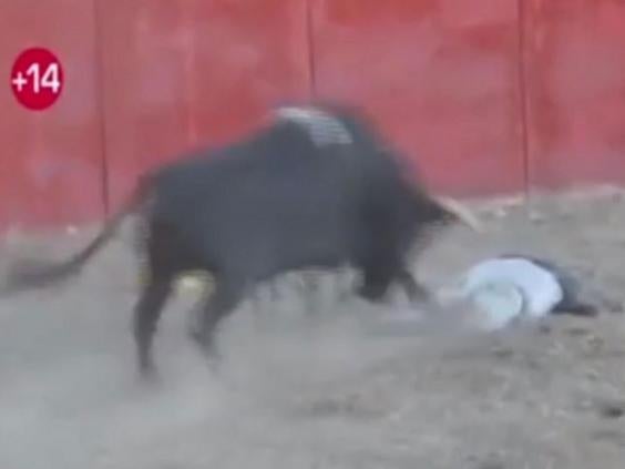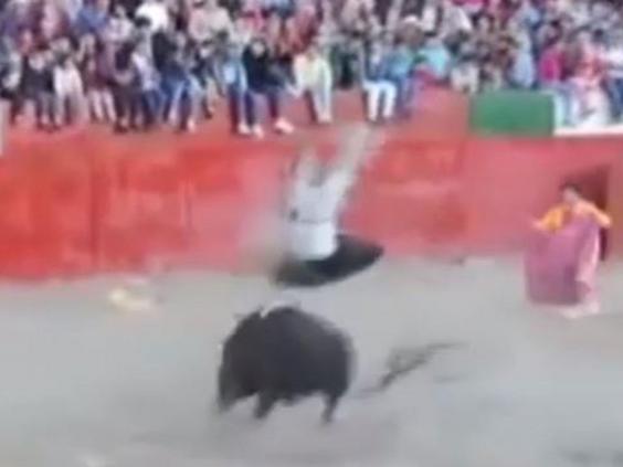 Footage shows the bull throwing the unnamed man from its back before running at him again.