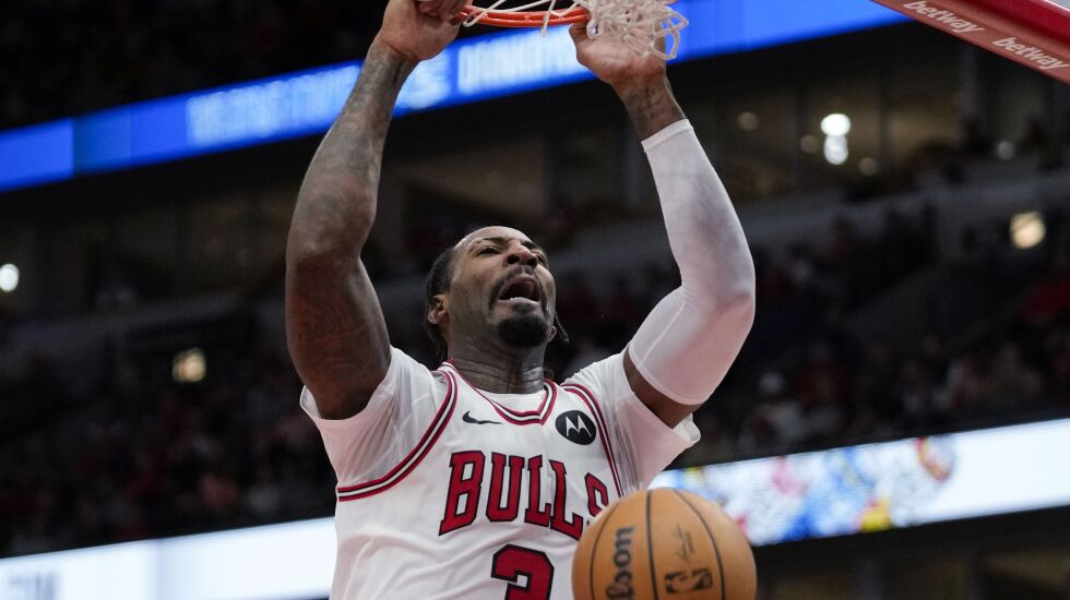 With the score tied at 106 in the fourth, it was Drummond who was diving on the floor to get the lead back. After a missed driving floater by guard Ayo Dosunmu, Drummond was there to clean up, grabbing the rebound and drawing a foul from the Hawks’ Trae Young. Guard Alex Caruso drained a three-pointer on the next play.