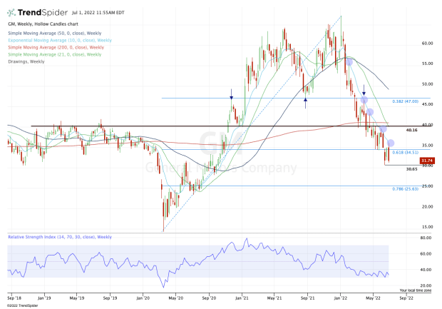 If GM stock can clear the 10-week moving average and $35, then we could see a larger push to the upside. Potentially, that could put the $40 area on the table. In that zone, GM has a key level that failed to hold as support, as well the declining 21-week moving average and the flat 200-week moving average.