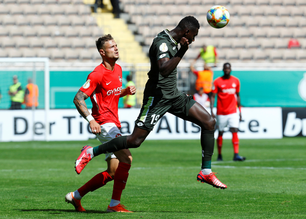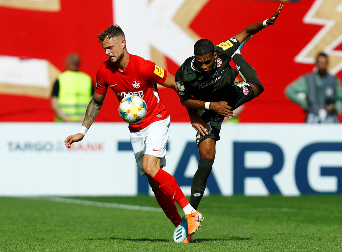 Soccer Football - DFB Cup - First Round - FC Kaiserslautern v 1.FSV Mainz 05 - Fritz-Walter Stadium, Kaiserslautern, Germany - August 10, 2019 1.FSV Mainz 05's Jerry St Juste in action with FC Kaiserslautern's Timmy Thiele REUTERS/Ralph Orlowski