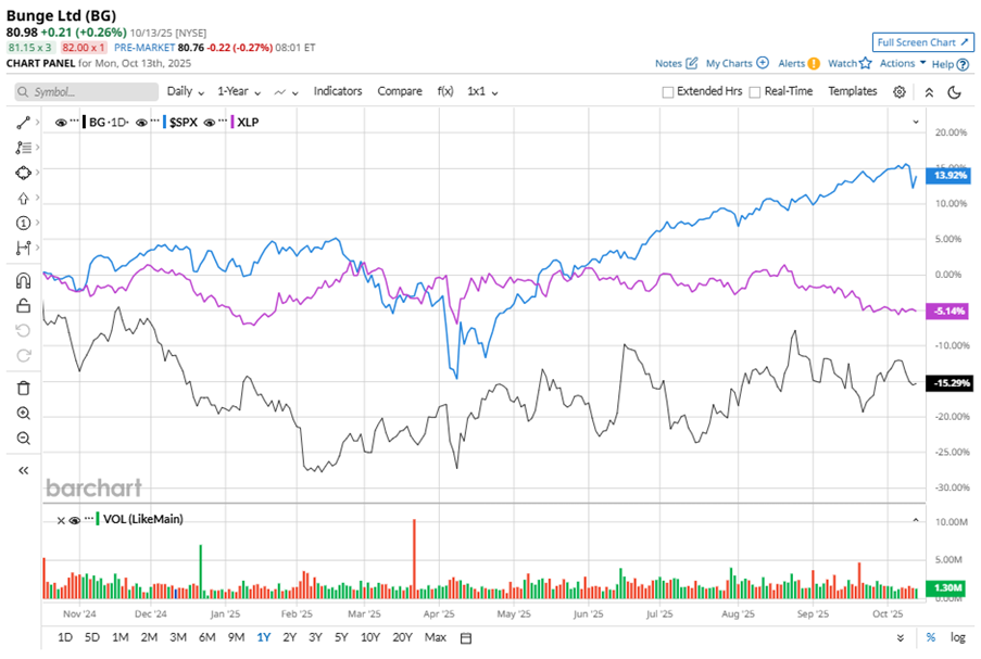BG stock has significantly underperformed the S&P 500 Index’s ($SPX) 14.4% gains over the past 52 weeks, with shares down 16.5% during this period. Similarly, it underperformed the Consumer Staples Select Sector SPDR Fund’s (XLP) 4.7% losses over the same time frame.