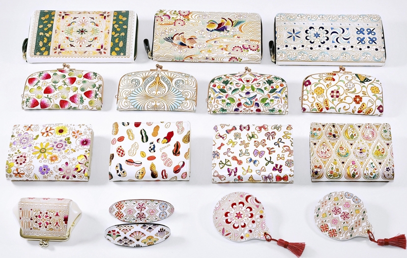 At Bunkoya Ozeki, more than 100 different patterns are embossed on bunkogawa products. Among them are such traditional motifs as a daimyo feudal lord's procession and the shichifukujin seven demigods. There are also cute patterns, such as strawberries and candies, as well as Egyptian-like patterns. They adorn a rich variety of products, from wallets and hair accessories to smartphone cases and clutches.