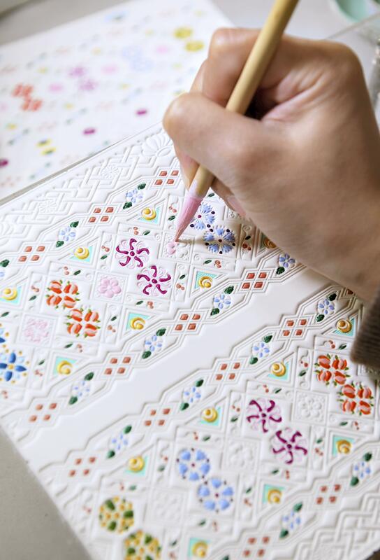 First, cowhide is cut to match each individual product. Every piece of leather is rubbed by hand until it becomes covered with creases, called shibo. The leather is then heated, patterns are embossed into it and colors are added one by one with brushes after the impressions are firmly set on the surface. There are eight basic colors, and an artisan mixes paints to create additional hues to suit each motif.