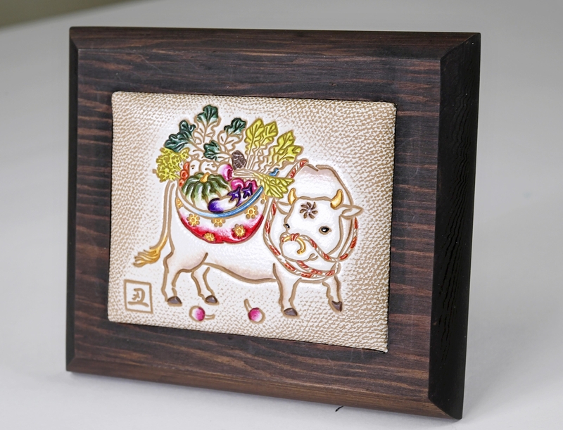 Set inside a cedar frame, the embossed leather of bunkogawa art looks almost as if it were not only for viewing but for touching, making it the perfect gift for any celebratory event.
