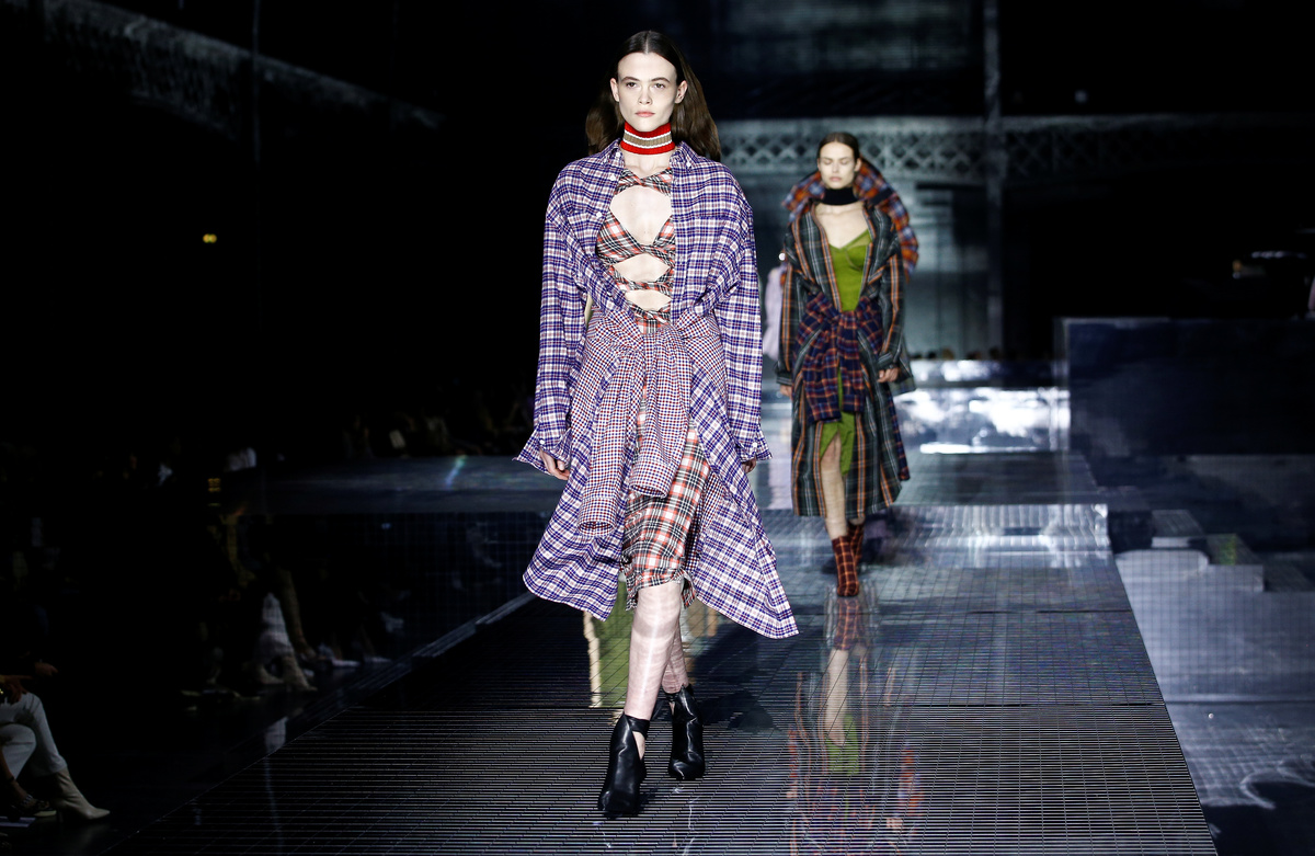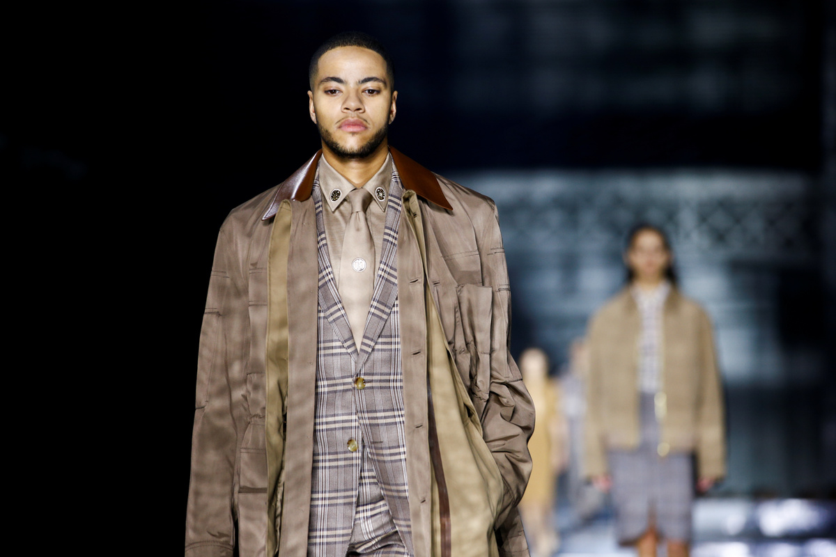 Riccardo Tisci drew inspiration from Burberry's design heritage by re-imagining the British label's trenchcoats and camel, black and red check at London Fashion Week on Monday.