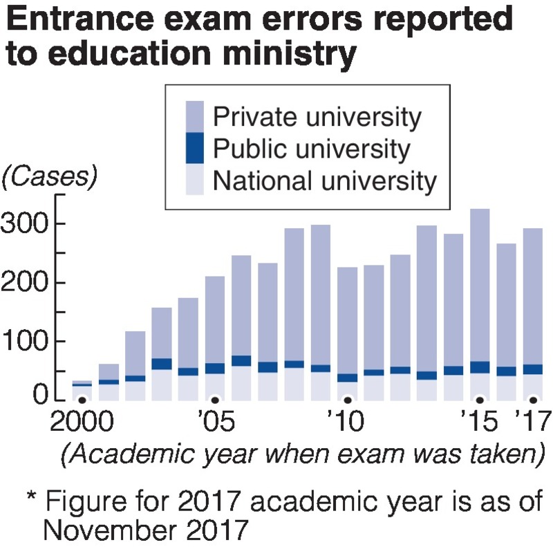 Every year, there are about 200 to 300 errors involving university entrance exams nationwide, made during such processes as preparing questions, scoring and clerical work. The Education, Culture, Sports, Science and Technology Ministry began asking national, public and private universities to report errors from exams starting from the 2000 academic year, when 33 errors were reported. For the 2017 academic year exams, 291 errors had been reported by 153 universities -- or 20 percent of all universities nationwide -- as of November 2017.