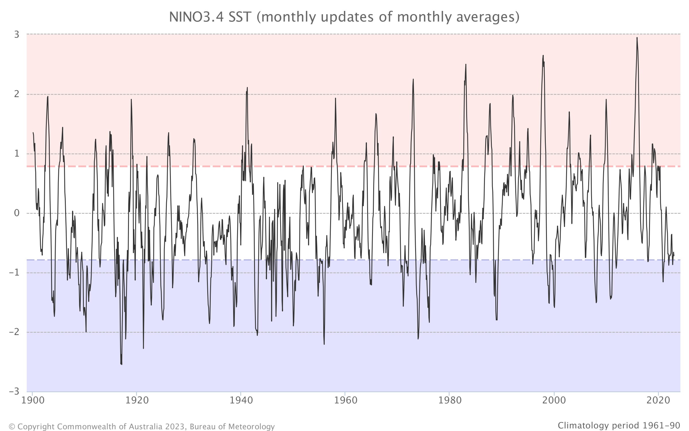 The BOM's current definition of Pacific oscillations has been in place for about two decades and includes an analysis of sea surface temperatures compared to the average in a small region, called Niño 3.4, of the tropical Pacific Ocean.