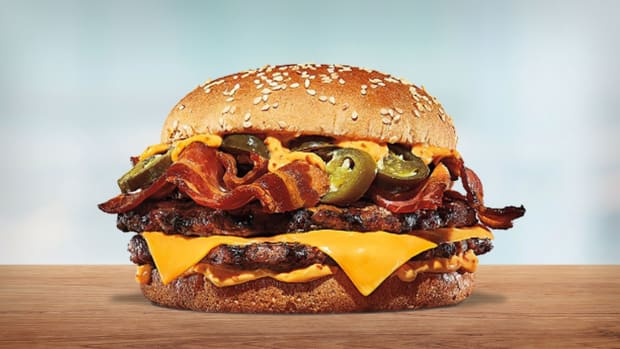 Called the Mango Habanero King, the new burger features two flame-grilled patties as a double and one as a single, two slices of American cheese, thick-cut bacon, mango habanero sauce, and spicy jalapenos--seeds in.