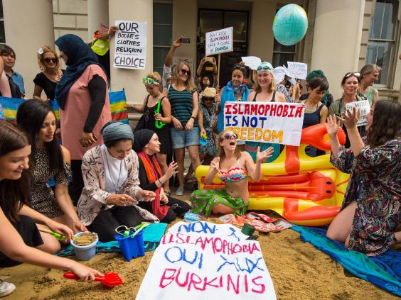 Demonstrators armed with lilos, inflatable flamingos and beach balls made sandcastles and chanted in opposition to “ludicrous” laws seeing Muslim women arrested and fined for covering up at Riviera resorts.