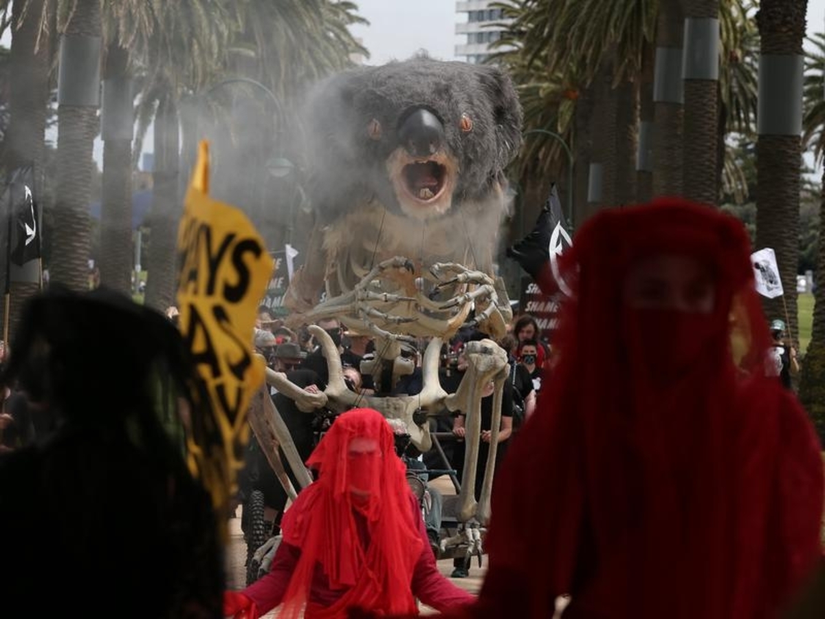 A giant koala emitting plumes of smoke, and dozens of skeletons on bicycles have converged on a beachside suburb of Melbourne as part of a climate protest.