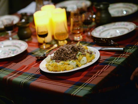 Haggis is served with the classic side of mashed neeps and tatties (swedes and potatoes). The food is, of course, accompanied by the finest domestic whisky.