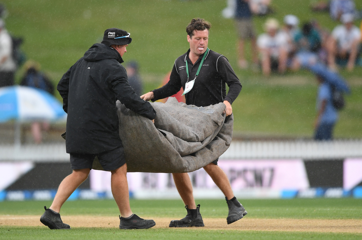 Cricket - New Zealand v England - Second Test - Seddon Park, Hamilton, New Zealand - December 1, 2019 Ground staff pull the cover as the match is delayed due to rain REUTERS/Ross Setford