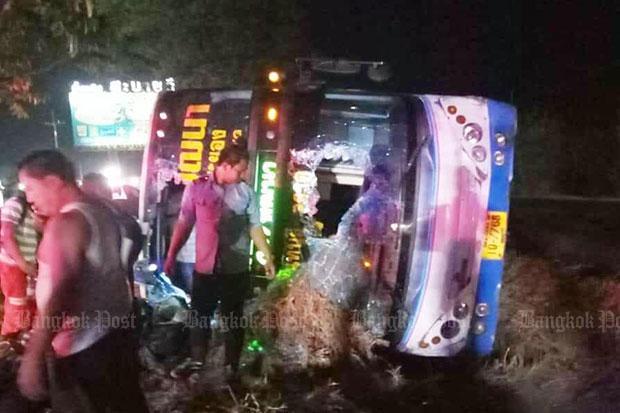 The bus, carrying 44 passengers, ran off the Mittaphab Highway into the centre dividing ditch and overturned in tambon Don Chomphu around 2.40am, the Hook 31 rescue team reported.