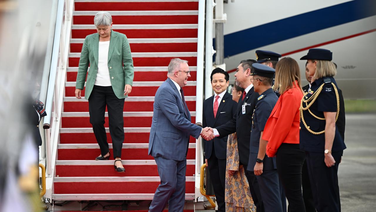 With a hint of rain hanging in the air after a heavy downpour, Mr Albanese was greeted on Tuesday evening by a white-suited military honour guard as he stepped down the stairs of a RAAF aircraft.