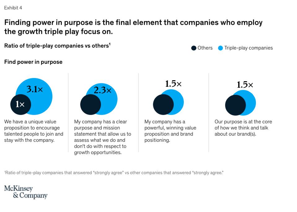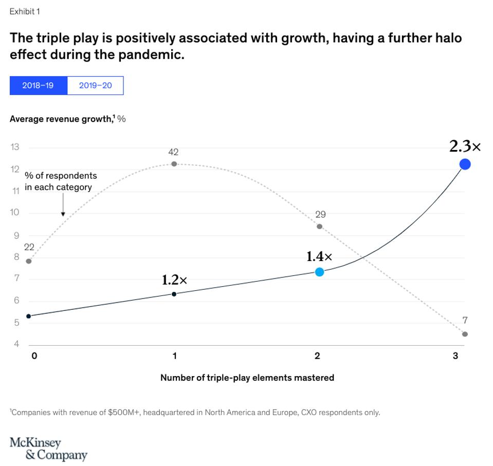 Recent McKinsey research uncovered a “growth triple play,” where successful companies integrate creativity, analytics, and purpose to deliver at least two-to-three times the growth of their peers. But even for those companies that used just one of the capabilities—either creativity, analytics, or purpose—they experienced an average growth rate of more than 6%. Those that added a second component saw growth rates climb to more than 7%. And for those that employed the full triple play, growth rates climbed to more than 12%.
